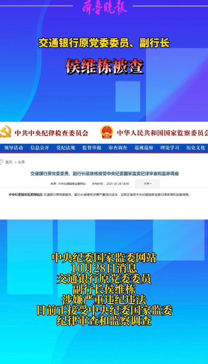 观政视频|交通银行原党委委员、副行长侯维栋被查 2025-10-29 原创齐鲁晚报·齐鲁壹点客户端 微信扫码扫码下载客户端中央纪委国家监委网站10月28日消息,交通银行原党委委员、副行长侯维栋涉嫌严重违纪违法,目前正接受中央纪委国家监委纪律审查和监察调查。