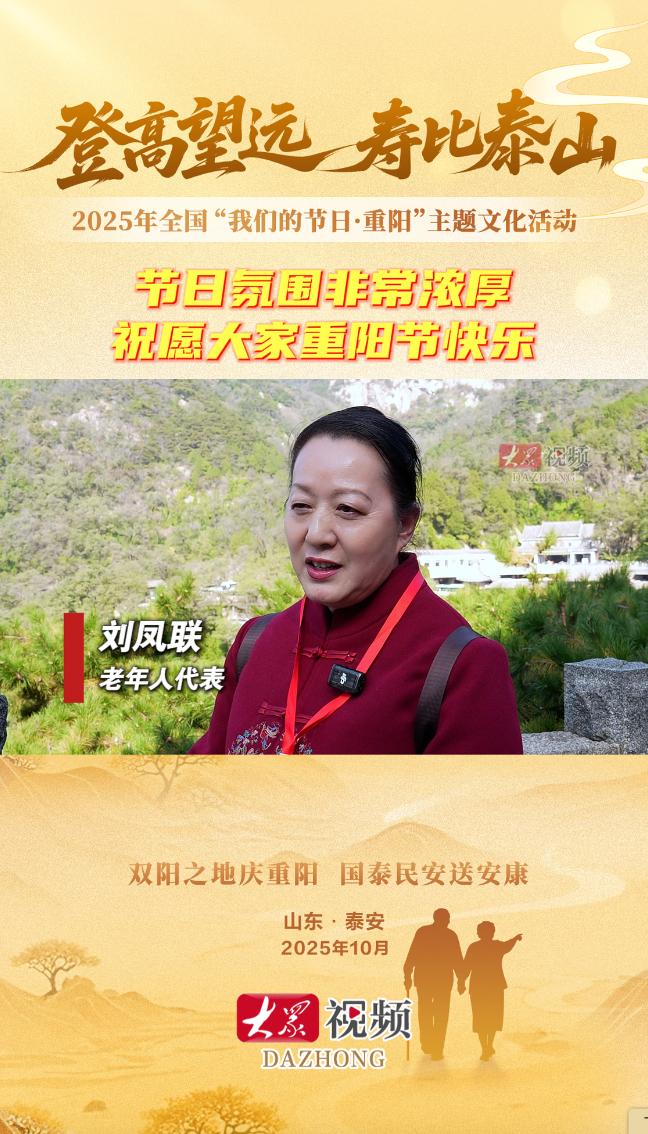 重阳时刻丨老年人代表刘凤联:节日氛围非常浓厚,祝愿大家重阳节快乐大众新闻 2025-10-29原创10 月 29 日,“登高望远·寿比泰山”——2025 年全国“我们的节日·重阳”主题文化活动在山东泰安举行。活动设置“岱宗迎重阳”“登高祈福祥”“云海寄安康”3 个篇章,大力弘扬尊老敬贤、孝老爱亲中华优秀传统美德。活动现场,老年人代表刘凤联分享了她的感受,她表示今天的节日氛围非常浓厚,祝愿大家重阳节快乐。(大众新闻记者 蓝天 刘涛 刘雅萍 策划 马玉峰)