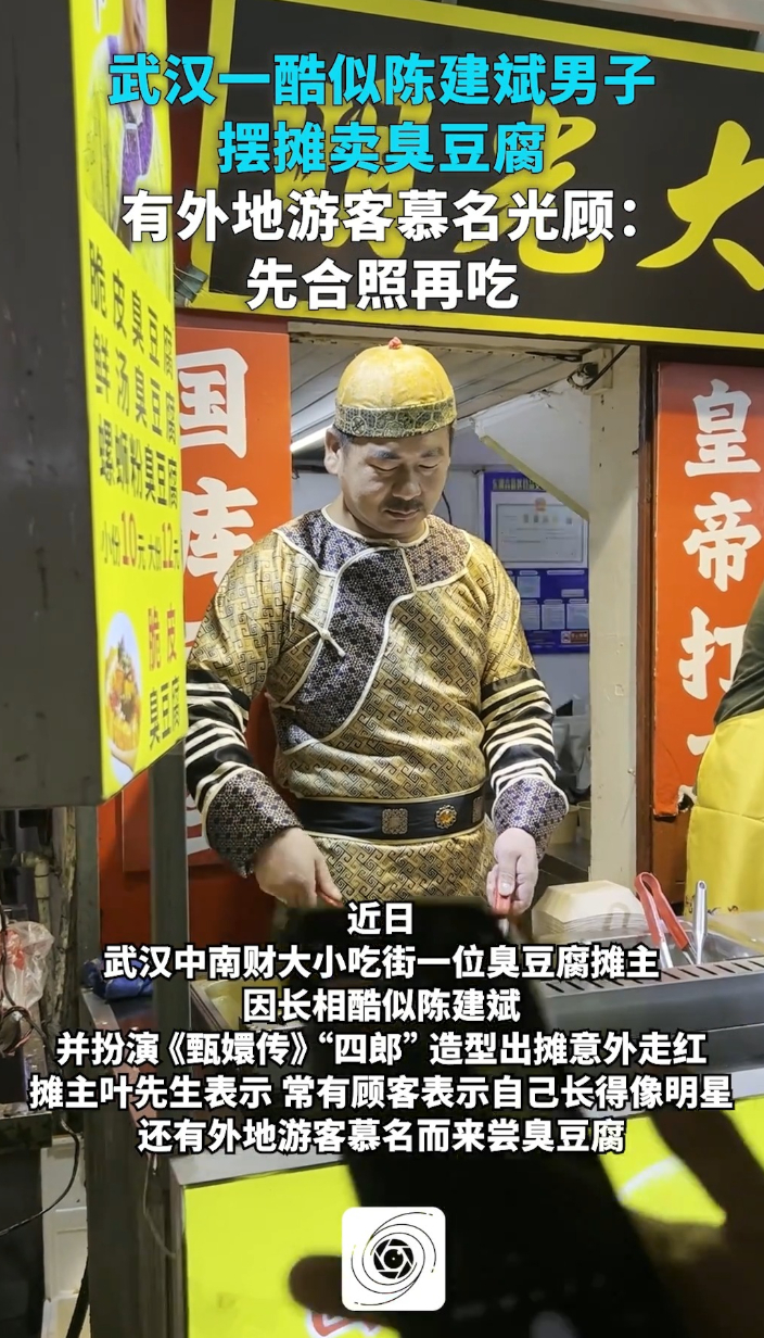 武汉“四郎臭豆腐”摊主回应侵权质疑:若陈建斌让我换造型一定换澎湃新闻 2025-10-31近日,武汉一摊位招牌取名“四郎臭豆腐”,摊主被网友评论长相酷似陈建斌,引发关注。摊主叶先生告诉澎湃新闻,多年前被告知长得像明星,若被告知侵权将换造型。(澎湃新闻)