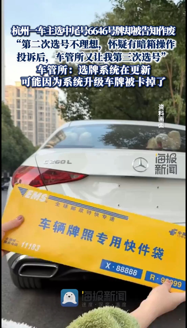 杭州一车主选中尾号6646号牌却被告知作废,车管所:可能因为系统升级车牌被卡掉了