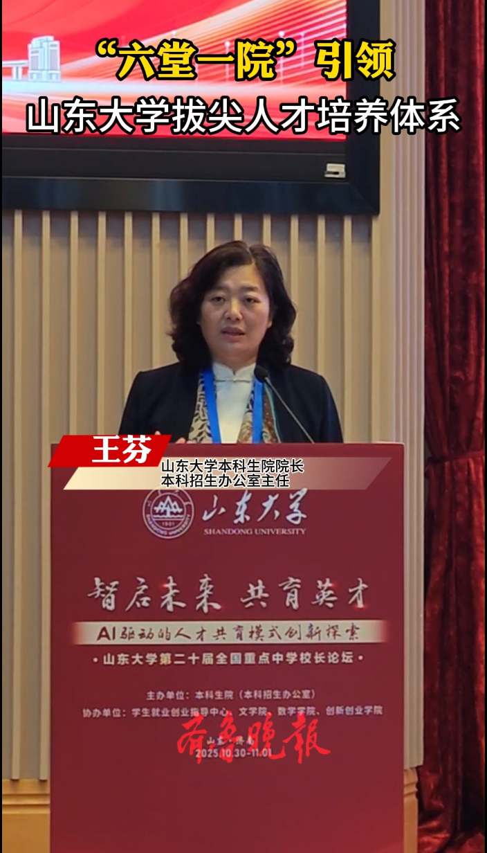 果然视频|“六堂一院”引领山东大学拔尖人才培养体系齐鲁壹点 | 2025-10-31 原创齐鲁晚报·齐鲁壹点客户端 微信扫码扫码下载客户端10月31日,山东大学举行第二十届全国重点中学校长论坛,学校本科生院院长、本科招生办公室主任王芬介绍,山东大学已经建立起以泰山学堂、尼山学堂、齐鲁医学堂、崇新学堂、经世学堂、钱七虎学堂、未来技术学院这“六堂一院”为引领的拔尖人才培养体系。(齐鲁晚报·齐鲁壹点记者 尹明亮)