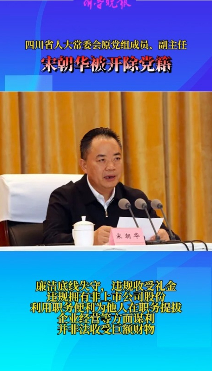 观政视频|四川省人大常委会原副主任宋朝华被开除党籍 2025-11-03 原创齐鲁晚报·齐鲁壹点客户端 微信扫码扫码下载客户端中央纪委国家监委网站11月3日消息,四川省人大常委会原党组成员、副主任宋朝华严重违纪违法被开除党籍。