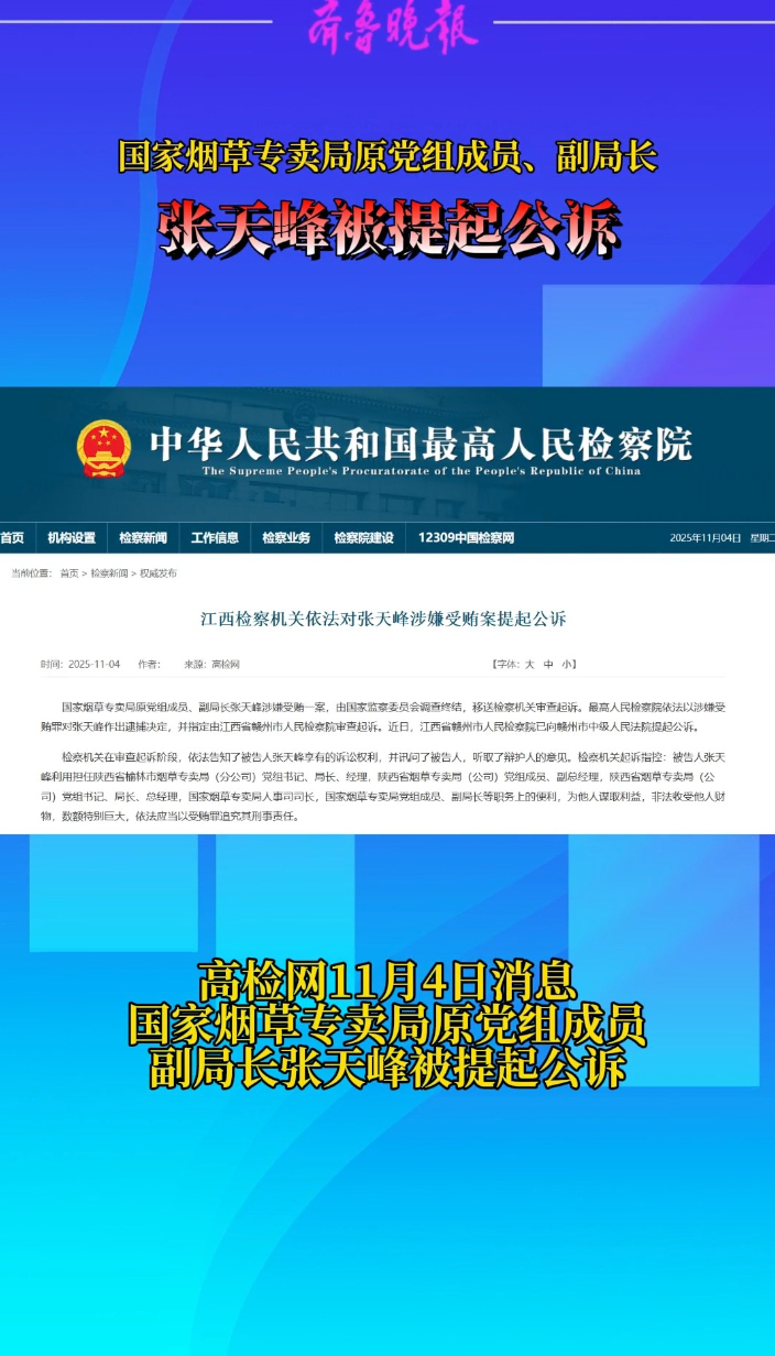 观政视频|国家烟草专卖局原副局长张天峰被提起公诉 2025-11-04 原创齐鲁晚报·齐鲁壹点客户端 微信扫码扫码下载客户端高检网11月4日消息,国家烟草专卖局原党组成员、副局长张天峰涉嫌受贿一案,由国家监察委员会调查终结,移送检察机关审查起诉。最高人民检察院依法以涉嫌受贿罪对张天峰作出逮捕决定,并指定由江西省赣州市人民检察院审查起诉。近日,江西省赣州市人民检察院已向赣州市中级人民法院提起公诉。