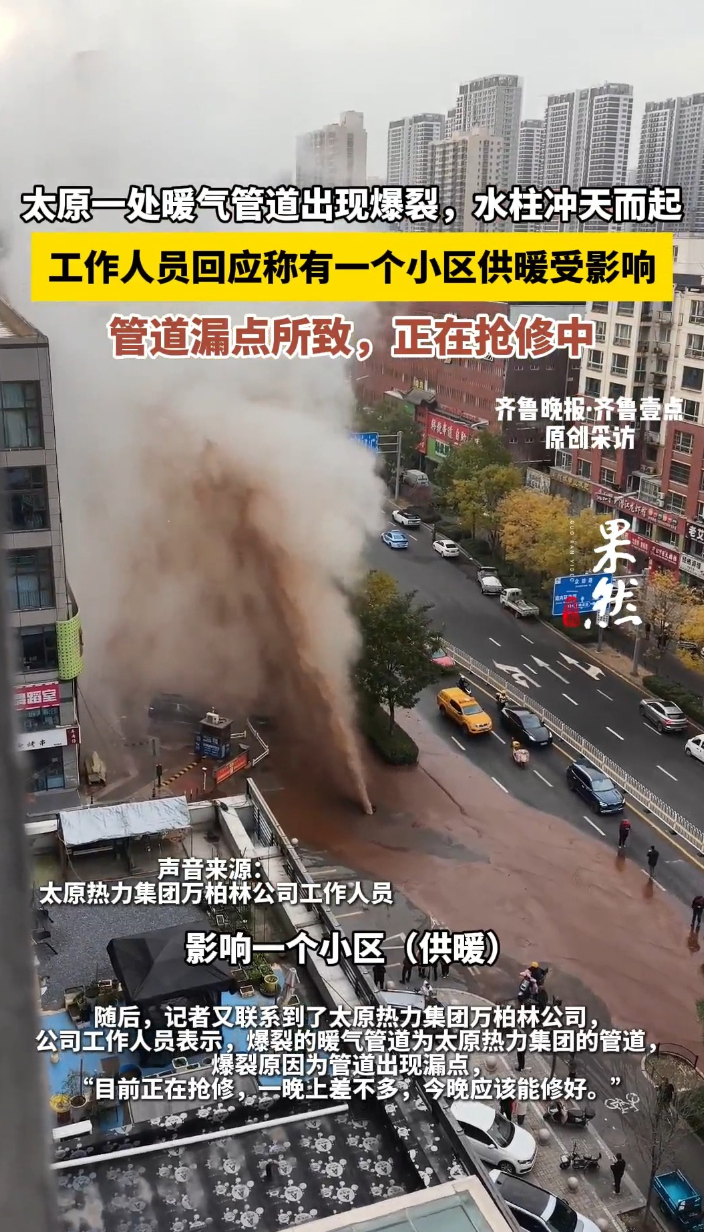 当晚,齐鲁晚报·齐鲁壹点记者致电太原热力集团万柏林公司,公司工作人员表示,爆裂的暖气管道为太原热力集团的管道,爆裂原因为管道出现漏点,目前正在抢修,一晚上差不多,今晚应该能修好。