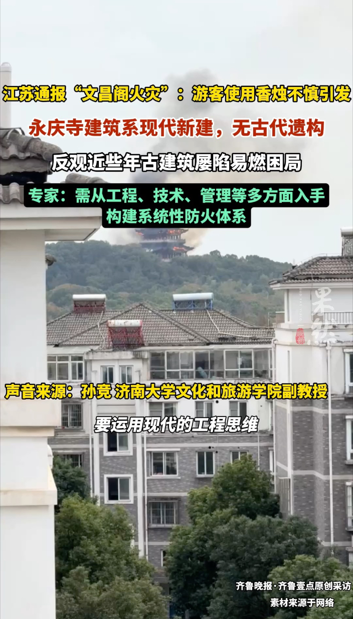 果然视频|近年古建筑频繁被烧,专家称要构建系统防火体系齐鲁晚报·齐鲁壹点客户端 2025-11-13原创近些年古建筑屡现易燃困局,接连发生的事故,让“古建筑消防保护”成为亟待正视的重要课题。济南大学文化和旅游学院副教授孙竞表示,在技术层面,应引入现代消防技术与设施;管理层面要重视日常巡查巡检,制定完善的应急预案并开展应急训练;此外,应对重点文物进行数字化扫描、建立完整档案。(齐鲁晚报·齐鲁壹点记者 路董萌 )