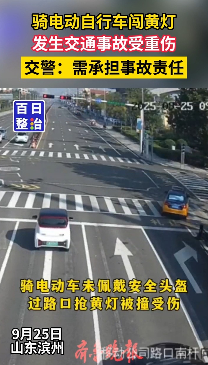 百日整治丨骑电动自行车闯黄灯被撞受伤,交警:需承担事故责任 2025-11-13 原创齐鲁晚报·齐鲁壹点客户端 微信扫码扫码下载客户端9月25日9时12分,滨州博兴的王某某驾驶电动自行车行驶至博城四路某交叉口时“抢黄灯”,与胡某驾驶的小型汽车相撞。事故发生时,王某某未佩戴头盔,导致王某某受伤较重。电动自行车驾驶人王某某因违反《中华人民共和国道路交通安全法实施条例》第38条第二款之规定,承担相应的事故责任。