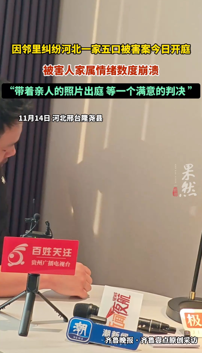 果然视频|河北邢台一家五口被害案今日开庭,家属带亲人照片出庭齐鲁晚报·齐鲁壹点客户端 2025-11-14原创因一条宽约1.5米的公共过道引发的邻里纠纷,李先生的邻居范某某杀害了他的五位至亲。犯罪嫌疑人范某某因涉嫌故意杀人罪被检察机关提起公诉。11月14日,该案在河北邢台隆尧县人民法院开庭审理。被害人家属李先生向齐鲁晚报・齐鲁壹点表示,他会带着亲人的照片出庭,期盼能等到一个满意的判决,以此告慰亲人的在天之灵。(齐鲁晚报·齐鲁壹点记者 胡玲玲 杨涛 路董萌)