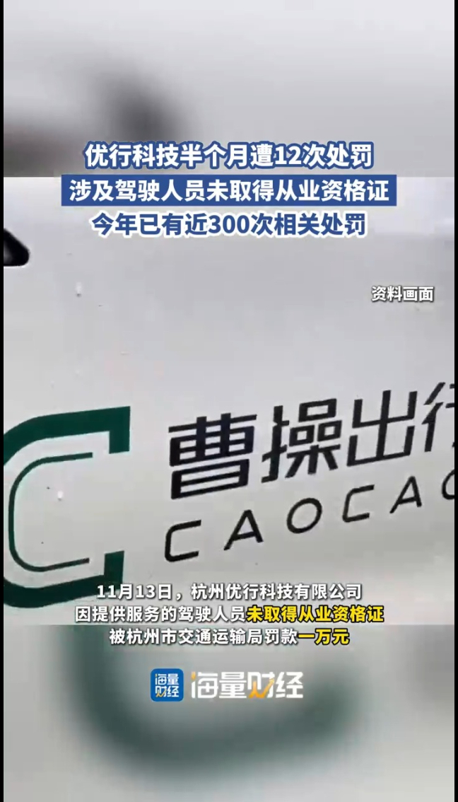 海量财经丨优行科技半个月被罚12次 因驾驶人员未取得从业资格证