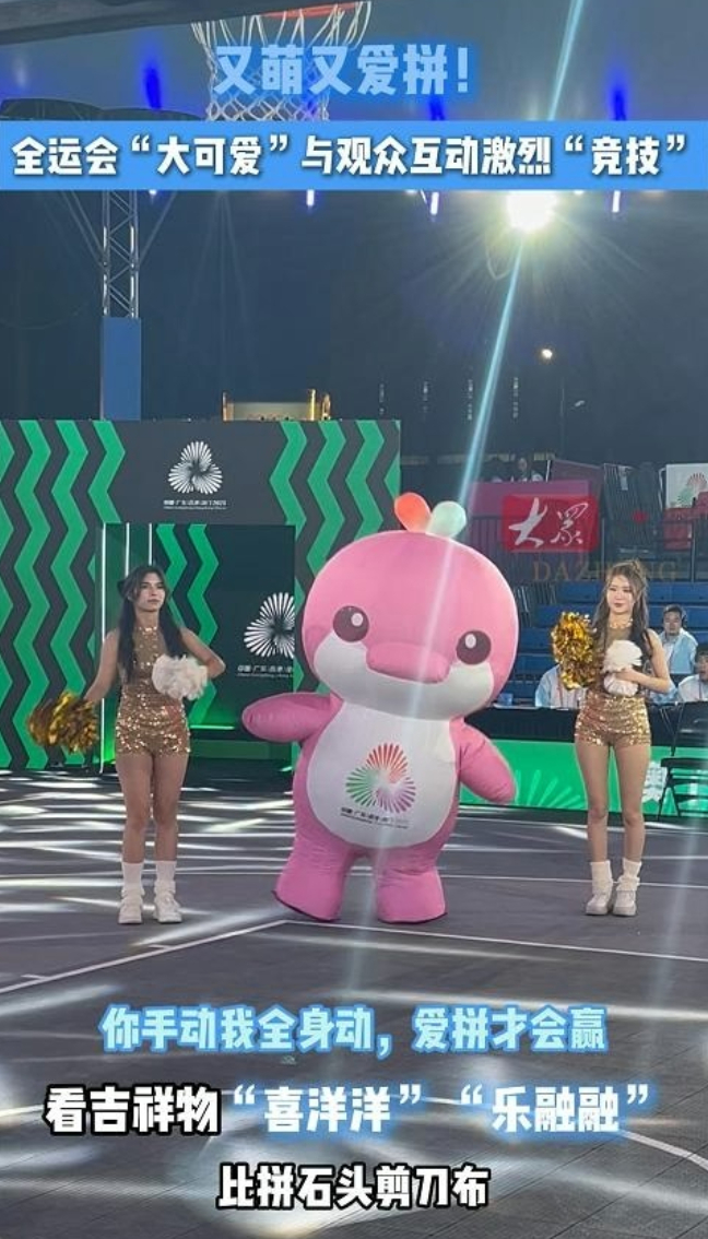 11月14日,第十五届全运会澳门赛区,三人篮球赛比赛间隙,由志愿者扮演的本届吉祥物“喜洋洋”“乐融融”闪亮登场,他们与观众热情互动,不仅表演萌系舞蹈及单脚跳等“大绝招”,而且与观众互动“竞赛”比拼石头剪刀布。因为他们没法用手指展现石头剪刀布,“喜洋洋”“乐融融”就用全身动作来展现,他们萌萌的样子和拼搏竞技的状态赢得现场观众阵阵欢笑和掌声。