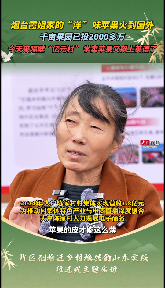 烟台霞姐家的“洋 ”味苹果火到国外大众新闻 2025-11-17原创11月17日—22日,“片区化推进乡村振兴的山东实践”行进式主题采访举行,立体化、集成式展现山东片区化推进乡村振兴和高质量打造乡村振兴齐鲁样板的生动实践和成效成果。11月17日,记者来到招远市大户陈家村,因说英语走红网络的苹果种植户“烟台霞姐”,向记者介绍几天前肯尼亚的客商来到她的果园。(大众新闻记者 孙雪萌 石少汛 刘英伟 策划 马玉峰 王磊)