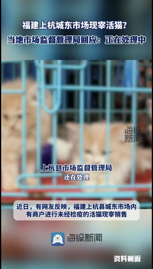 福建上杭一市场现宰无检疫活猫?当地市场监管局回应:正在处理大众新闻·海报新闻 2025-11-18原创近日,有网友称福建上杭县城东市场内有商户进行未经检疫的活猫现宰销售。11月18日,上杭县市场监督管理局工作人员告诉海报新闻记者,已经在了解情况并进行处理,目前不便透露更多内容。(大众新闻·海报新闻记者 赵恩 报道)