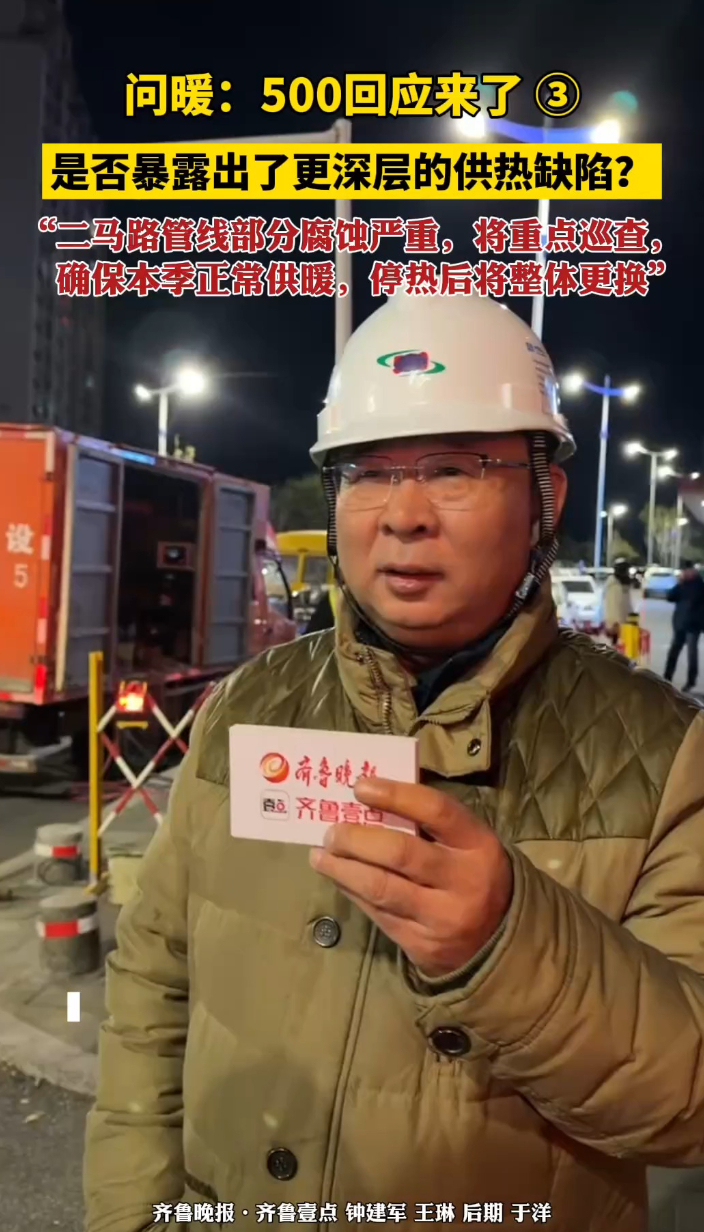 问暖:500回应来了③二马路供暖管线腐蚀严重,明年将整体更换齐鲁晚报·齐鲁壹点客户端 2025-11-19原创11月16日,烟台正式进入供热时间,但烟台主城区部分小区因为管道爆管,至今暖气冰冷。19日晚间,烟台500供热公司就齐鲁晚报·齐鲁壹点的报道作出回应,向市民表达歉意。有关负责人表示,二马路管线部分腐蚀严重,将重点巡查,确保本季正常供暖,停热后将整体更换。(齐鲁晚报·齐鲁壹点 王琳 钟建军 后期 于洋)
