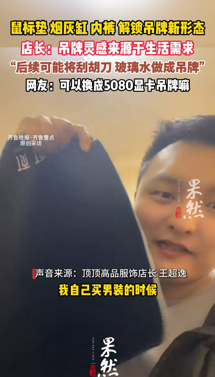 近日,江苏苏州一服装店长另辟蹊径,将店内男服装吊牌换成鼠标垫、烟灰缸、内裤等,获得众多网友好评。11月21日,顶顶高品服饰店长王超逸告诉记者,这些吊牌的灵感都是来源于他平时生活的需求。他还表示,后期可能会将刮胡刀、玻璃水等一些实用的物品做成吊牌。不少网友评论道:“可以换成5080显卡吊牌嘛!”(齐鲁晚报·齐鲁壹点爆料电话:0531-85193656;邮箱:405617016@qq.com)