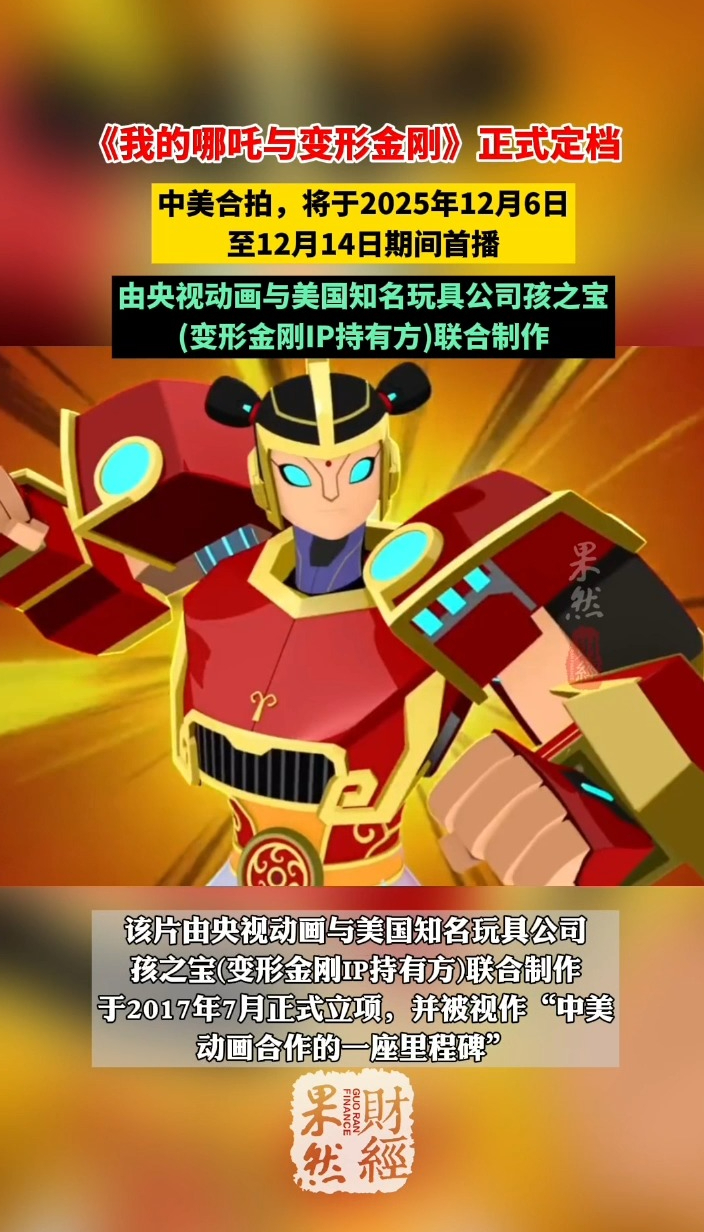 果然财经|中美合拍动画片《我的哪吒与变形金刚》正式定档齐鲁晚报·齐鲁壹点客户端 2025-11-21原创曾引发广泛关注的中美合拍动画《我的哪吒与变形金刚》终于正式定档。中央电视台少儿频道今日宣布,该片将于2025年12月6日至12月14日期间首播,每日20:30更新,全片共52集