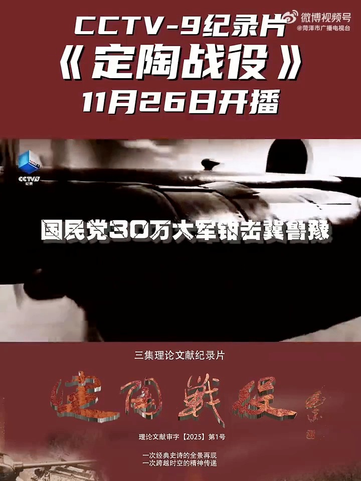 记者获悉,三集理论文献纪录片《定陶战役》,定于11月26日在中央广播电视总台纪录片频道播出。