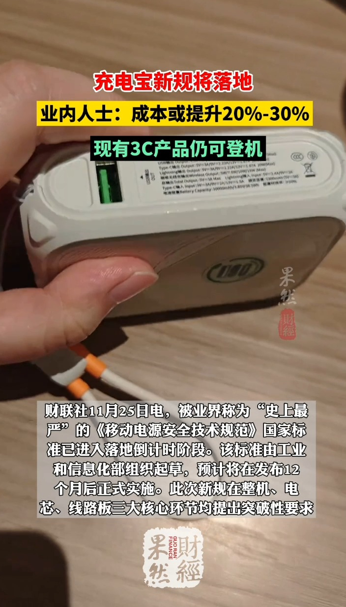 果然财经|充电宝新规将落地,成本或提升20%-30%齐鲁晚报·齐鲁壹点客户端 2025-11-25原创财联社11月25日电,被业界称为“史上最严”的《移动电源安全技术规范》国家标准已进入落地倒计时阶段。该标准由工业和信息化部组织起草,预计将在发布12个月后正式实施。此次新规在整机、电芯、线路板三大核心环节均提出突破性要求。参与新标准研讨会的惠州马拉松固态新能源电池科技有限公司相关负责人透露,新标准实施后,行业整体成本将提升20%-30%。
