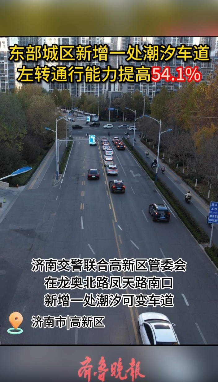 济南高新区一路口新增潮汐车道,车辆左转通行能力提高54.1%齐鲁晚报·齐鲁壹点客户端 2025-11-25原创近日,济南交警结合民意诉求,深入开展“治堵治乱保畅”专项行动,依托交通大脑精准研判,在高新区管委会的支持和配合下,在龙奥北路凤天路路口设置潮汐车道。改造后,路口南口左转车辆通行能力提升54.1%,取得明显治堵成效。