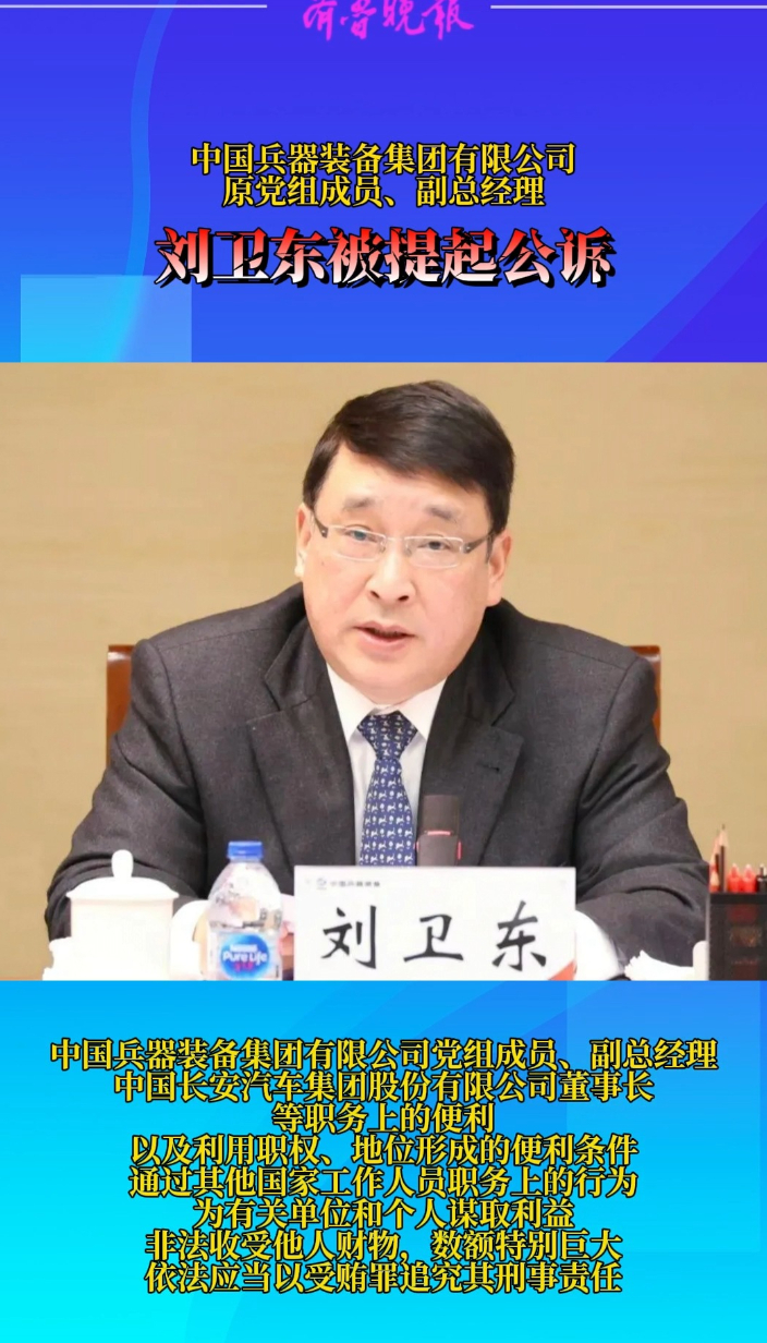 观政视频|中国兵器装备集团有限公司原副总经理刘卫东被提起公诉 2025-11-26 原创齐鲁晚报·齐鲁壹点客户端 微信扫码扫码下载客户端中国兵器装备集团有限公司原党组成员、副总经理刘卫东涉嫌受贿一案,由国家监察委员会调查终结,移送检察机关审查起诉。经最高人民检察院指定管辖,河南省人民检察院依法以涉嫌受贿罪对刘卫东作出逮捕决定。近日,河南省南阳市人民检察院已向南阳市中级人民法院提起公诉。