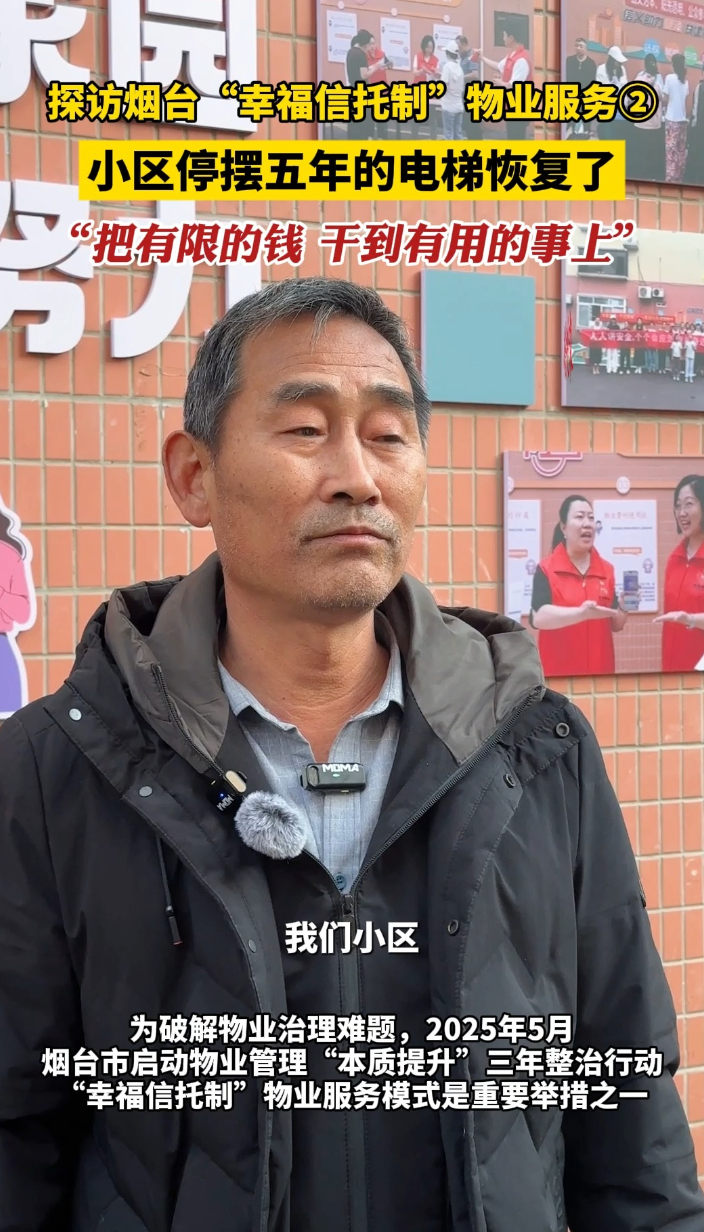 烟台幸福信托制物业探访②小区停摆五年的电梯恢复了齐鲁晚报·齐鲁壹点客户端 2025-11-28原创11月26日下午,“信托赋能幸福烟台·创新共建美好家园”烟台市幸福信托制实践成果媒体探访行,先后来到开发区新世纪现代公寓小区、静海阳光海岸小区,小区居民表示引入“信托制”物业服务模式后,小区停摆五年的电梯恢复了,“把有限的钱,干到有用的事上。”(齐鲁晚报·齐鲁壹点 杜晓丹)