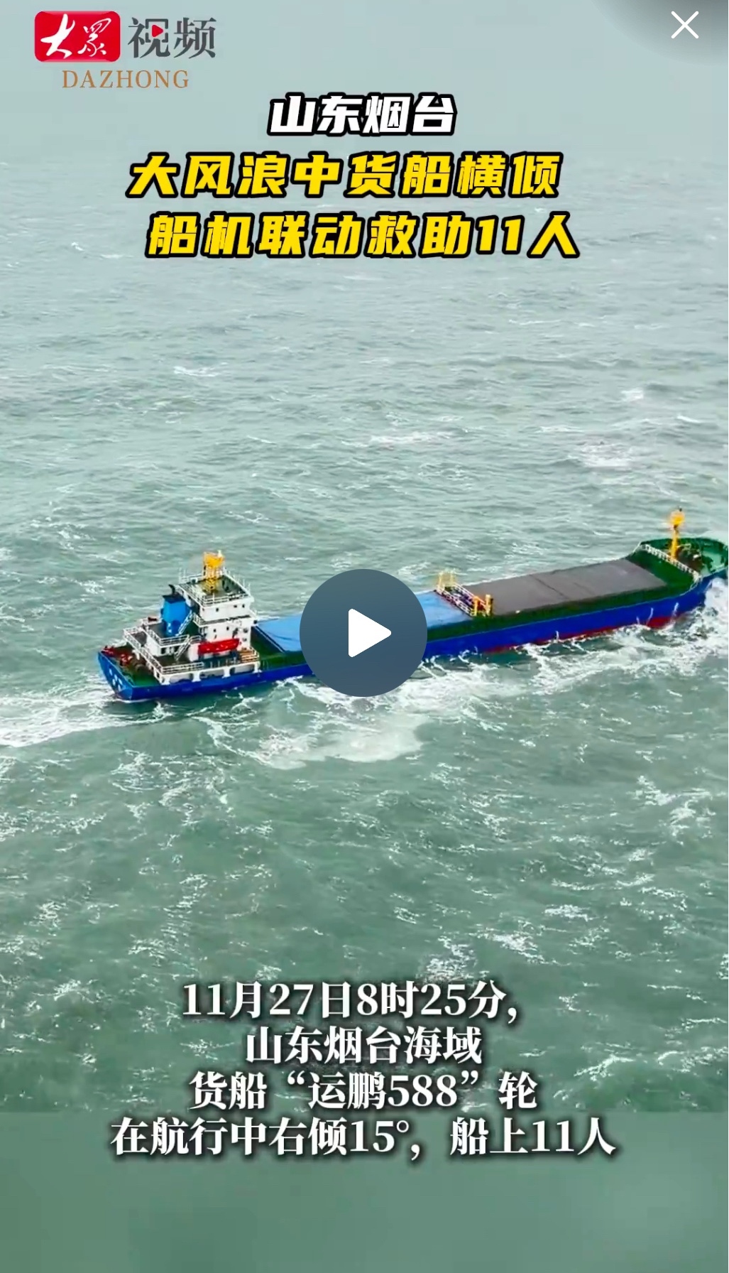大风浪中19次精准吊运,“运鹏588”轮全员获救大众新闻客户端 2025-11-28原创11月27日8时25分,山东烟台海域,货船“运鹏588”轮航行过程中右倾15°,船上11人,情况紧急,请求救助。接报后,北海救助局立即派遣蓬莱待命救助直升机“B-7313”“B-72G0”和大功率专业救助船“北海救119”轮奔赴现场救助。经过19次空中吊运作业,仅用时34分钟,就将11名船员安全转移至“北海救119”轮。(大众新闻记者 范薇 实习生 邱彦频)
