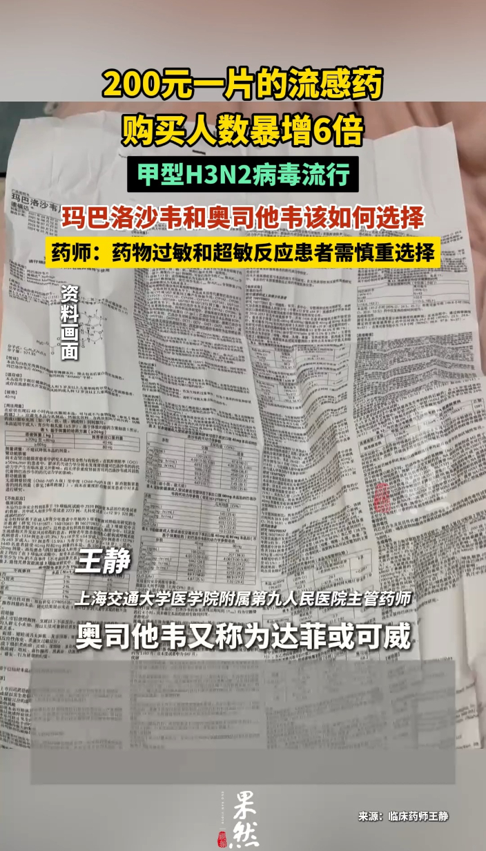 果然视频|200元一片的流感药购买人数暴增6倍,流感药怎么选齐鲁晚报·齐鲁壹点客户端 12-01原创据阿里健康平台数据显示,11月中旬流感药品购买量有明显提升,流感抗病毒药物购买人数环比增长超500%。其中玛巴洛沙韦尤为突出,购买人数环比增长超600%。据新京报报道,自11月17日到11月23日,奥司他韦销量环比增长4.5倍,玛巴洛沙韦增长5倍,流感检测试剂增长4.8倍,止咳化痰与解热镇痛类药物增长超3倍。(齐鲁晚报·齐鲁壹点 郭辰昊)