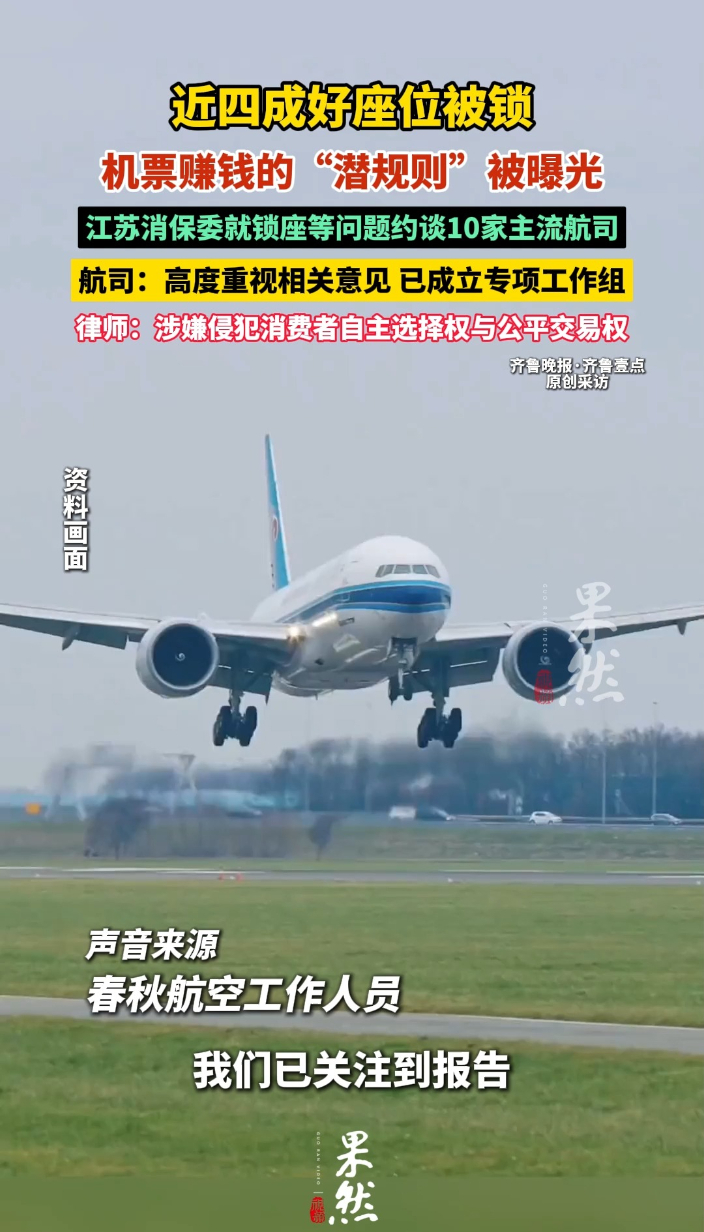 果然视频|飞机近四成好座位被锁,律师:涉嫌侵犯消费者选择权齐鲁晚报·齐鲁壹点客户端 2025-12-02原创近日,江苏省消费者权益保护委员会发布机票锁座调查报告,通报了航司锁座行为普遍存在、优质座位过度锁定、解锁机制变相付费等问题引发关注。12月2日,齐鲁晚报·齐鲁壹点记者致电多家航司,但未获知最新解决方案。(齐鲁晚报·齐鲁壹点爆料电话:0531-85193656;邮箱:405617016@qq.com)(齐鲁晚报·齐鲁壹点 郭辰昊 杨涛)
