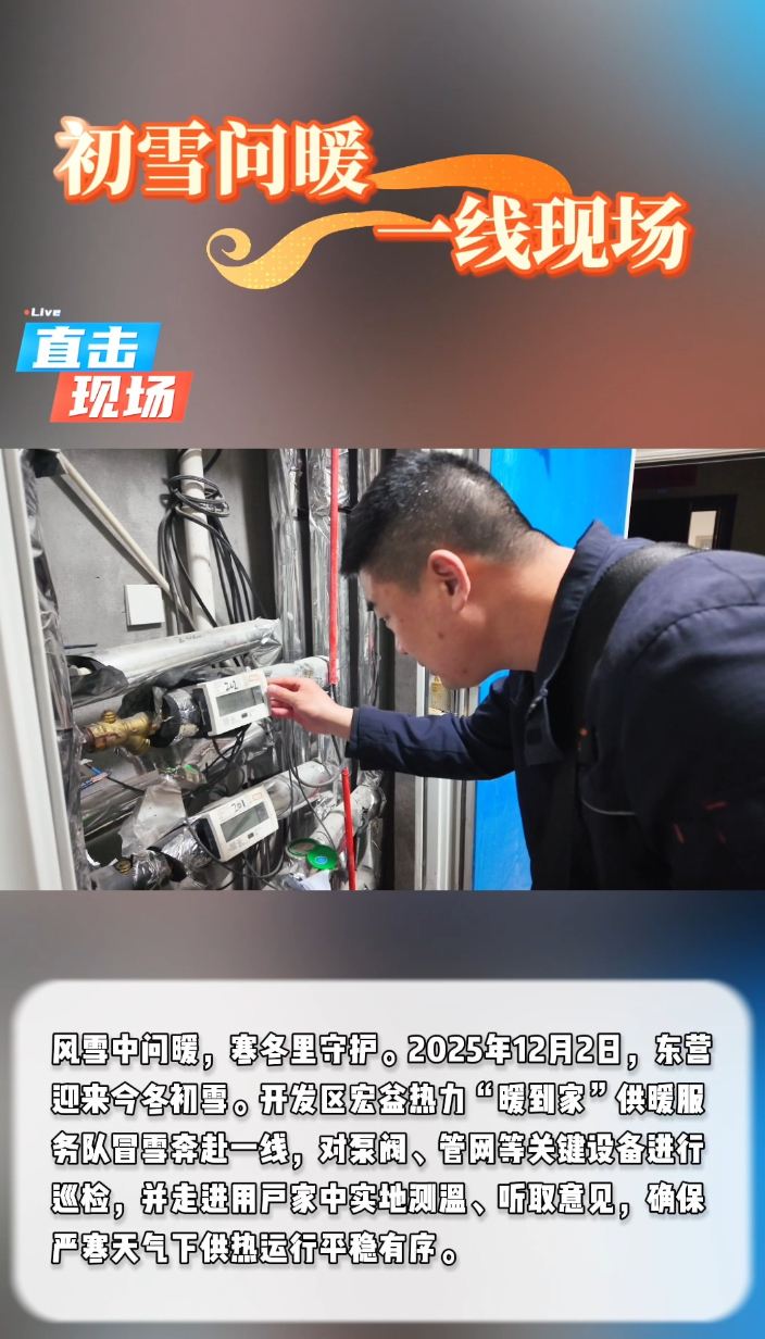 风雪中,东营供暖人“温暖在线”齐鲁晚报·齐鲁壹点客户端 2025-12-02原创风雪中问暖,寒冬里守护。2025年12月2日,东营迎来今冬初雪。开发区宏益热力“暖到家”供暖服务队冒雪奔赴一线,对泵阀、管网等关键设备进行巡检,并走进用户家中实地测温、听取意见,确保严寒天气下供热运行平稳有序。(大众新闻记者 王帅 张婧婧)