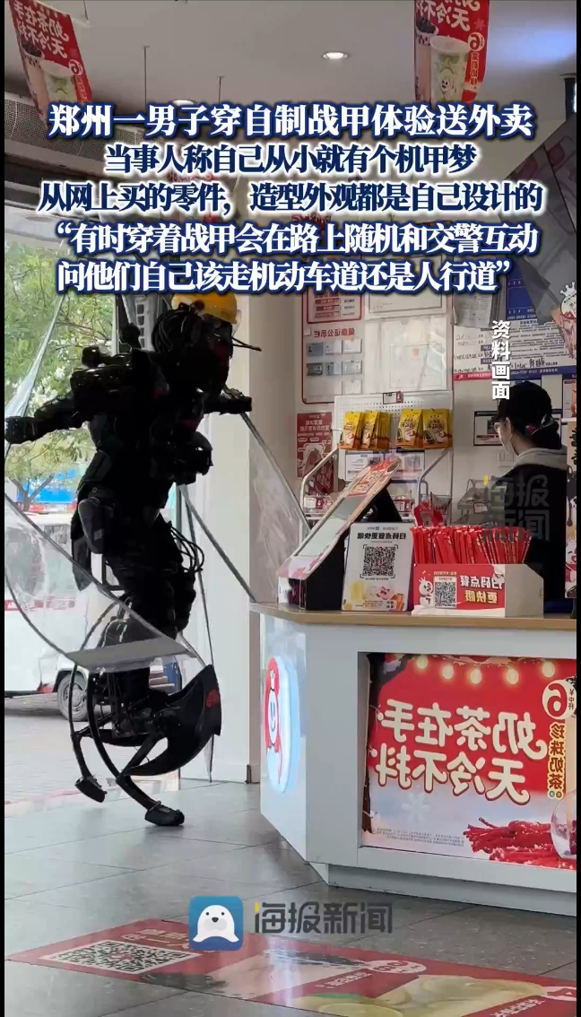 郑州一男子穿自制战甲体验送外卖,还问交警:我该走人行道还是机动车道