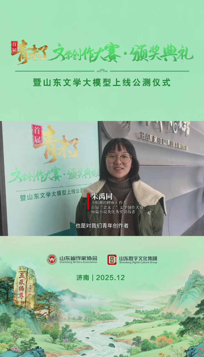 果然视频|短篇小说优秀奖获得者朱禹同:我是文学院的在读硕士大众报业·齐鲁壹点 2025-12-04文脉赓续,梦想绽放。12月3日,首届“青未了”文学创作大赛颁奖典礼在山东济南隆重举行。来自山东大学文学院中国现当代文学专业的硕士研究生朱禹同借凭借短篇小说《明湖的鲤鱼》获得短篇小说类优秀奖。朱禹同表示,非常荣幸自己的作品获得了很高的认可,这也是对他们青年创作者比较大的鼓励,希望青未了文学创作大赛今后能越办越好。(齐鲁晚报·齐鲁壹点 戚云雷)