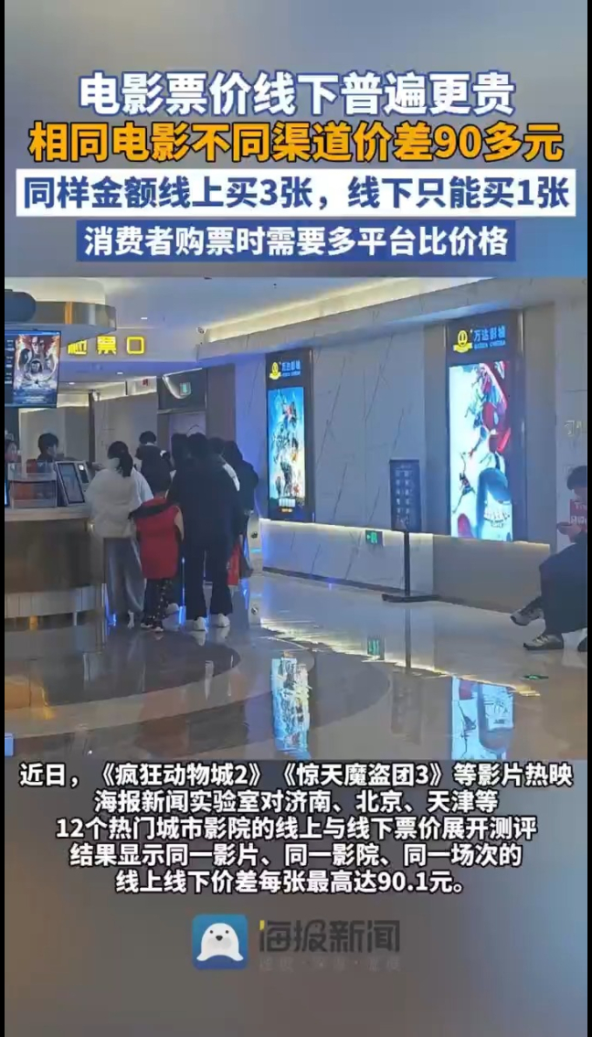 近日,《疯狂动物城2》《惊天魔盗团3》等影片热映,海报新闻实验室对济南、北京、天津等12个热门城市影院的线上(淘票票、猫眼等平台)与线下(影院柜台)票价展开测评,结果显示同一影片、同一影院、同一场次的线上线下价差每张最高达90.1元,同样金额线上买3张,线下只能买1张。此外,不同城市同影片的价格差异也十分明显,以《疯狂动物城2》为例,上海大光明电影院南京西路店最低价为60元/张,南京星耀汇影城新街口大洋晶典店最低价则为29.9元/张,差价相差一倍。