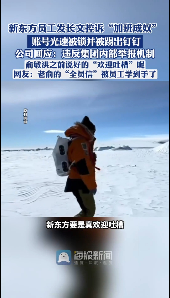 咱们先看看这员工到底说了啥。他说自己拜读了俞敏洪从南极发来的信,信里满是“教育初心”“以人为本”,可自己每天要干12个小时,劳动合同写的双休早没了,招生指标高得离谱,活生生把自己熬成了加班机器。更扎心的是,他正是因为看到俞敏洪说“欢迎公开吐槽”,才鼓起勇气说真话,还引用俞敏洪的话问“公司不断损害员工,还算好公司吗”,字字都是打工人的心酸。