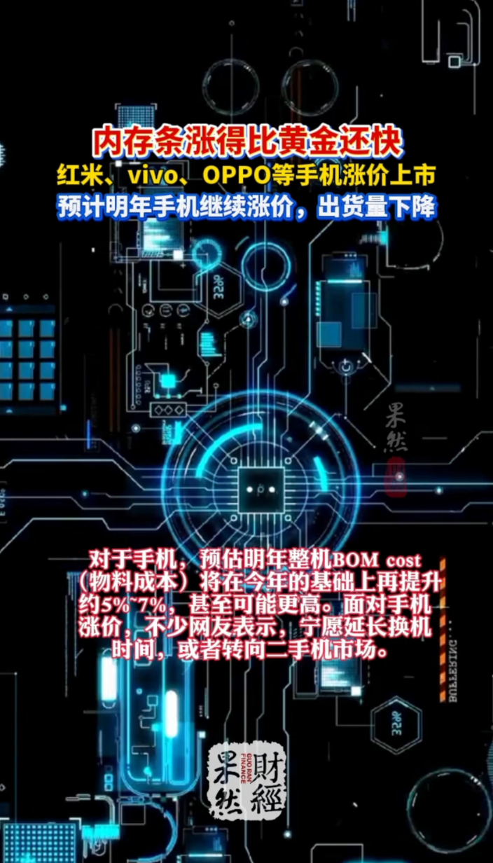 果然财经|内存条价格疯涨,手机明年或继续涨价齐鲁晚报·齐鲁壹点客户端 2025-12-06原创存储成本上涨传递至终端。日前,多个品牌新款手机上市,起售价涨幅100元至300元不等。存储业内人士预计,本轮存储芯片价格持续上涨的周期比上一轮八个季度的周期更长,整体智能手机价格也会往上调。