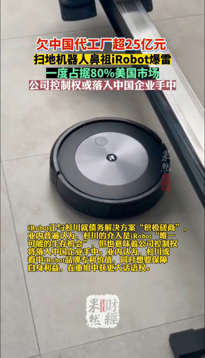 果然财经|美国知名机器人公司爆雷,控制权或落入中国企业之手齐鲁晚报·齐鲁壹点客户端 2025-12-06原创综合消息,曾被誉为扫地机器人行业“鼻祖”的美国消费机器人巨头iRobot,被曝已陷入严重财务危机!截至11月24日,公司共欠中国深圳代工厂杉川机器人超3.5亿美元 (约25亿元人民币),而其现金储备仅剩2480万美元,已处于技术性破产边缘。