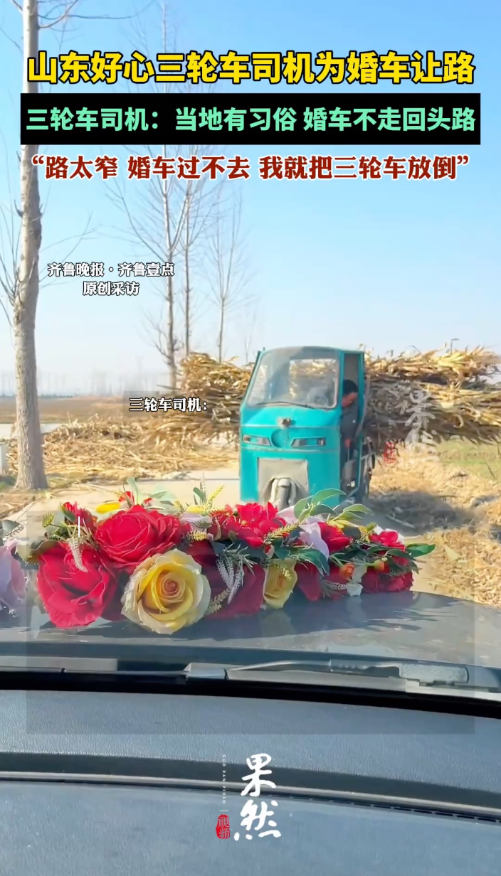 果然视频|为让婚车“不回头”,济南三轮车司机直接推翻爱车齐鲁晚报·齐鲁壹点客户端 2025-12-06原创12月6日,山东济南。一位网友发布视频称,接亲车队遇三轮车,道路太窄,三轮车司机主动让路。三轮车司机称:“当地有习俗,婚车不走回头路。”他告诉记者,路太窄,就干脆把自己的三轮车放倒,让婚车过去,毕竟是人家大喜的日子。(齐鲁晚报·齐鲁壹点爆料电话:0531-85193656;邮箱:405617016@qq.com)(齐鲁晚报·齐鲁壹点 杜嘉文)