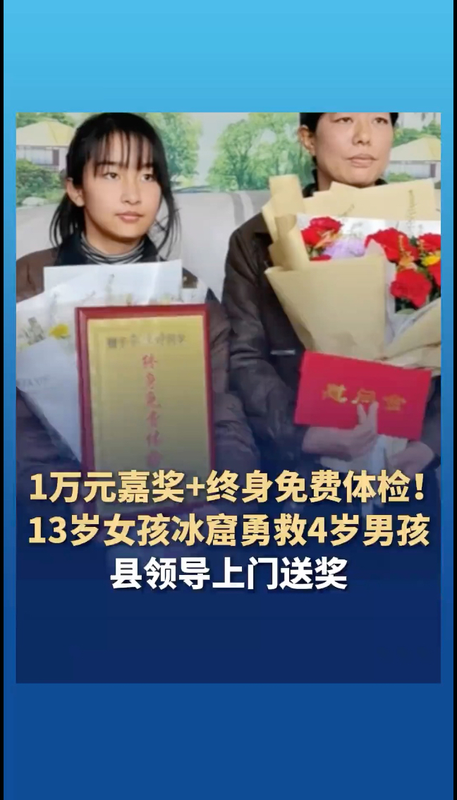 1万元嘉奖+终身免费体检!13岁女孩冰窟勇救4岁男孩,县领导上门送奖