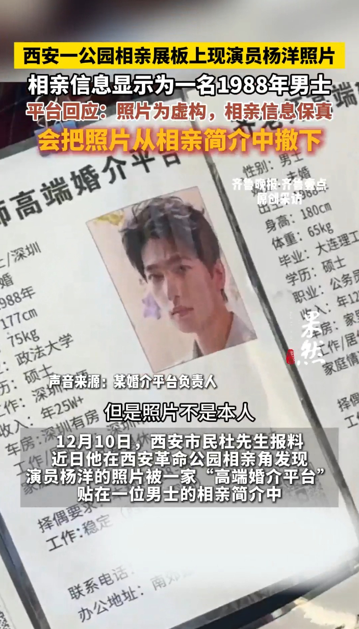 果然视频|西安一公园相亲展板上现演员杨洋照片,平台回应:照片为虚构齐鲁晚报·齐鲁壹点客户端 2025-12-10原创12月10日,西安市民杜先生报料,近日他在西安革命公园相亲角发现演员杨洋的照片被一家“高端婚介平台”贴在一位男士的相亲简介中。展板信息显示,该相亲者1988年出生,政法大学硕士,目前在深圳从事律师工作,年薪超25万元。
