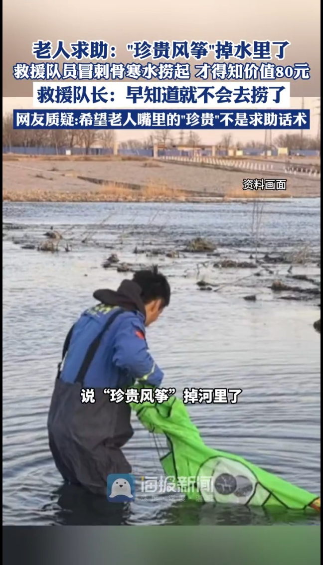 一位老人求助房山蓝天救援队,说“珍贵风筝”掉河里了。队员顶着零下五六度的严寒下水打捞,上岸才得知——这风筝市场价80块。一句“珍贵”,让救援队经历了刺骨的河水,更经历了心里的“说不出的痛”。
