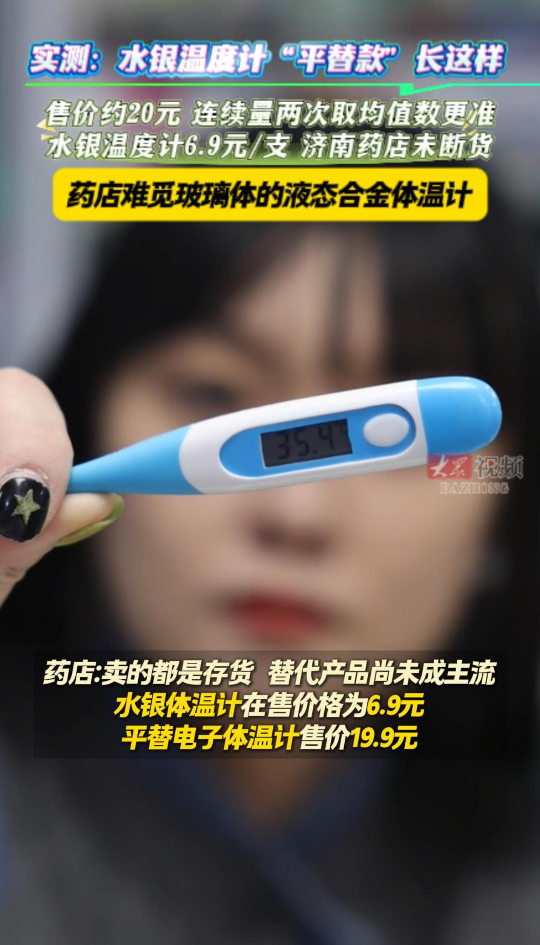告别 “甩一甩” 时代,安全测温平替如何选?记者实探济南多家药房,药房工作人员表示,水银温度计目前在售均为存货,平替电子温度计产品尚未成主流。对于网友关心的价格问题,记者走访济南漱玉平民大药房,在售货架上看到水银体温计价格为6.9元,平替电子体温计售价19.9元,并未出现涨价情况。