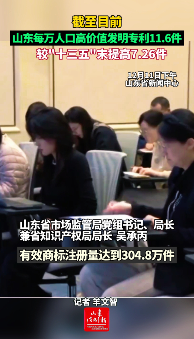 截至目前,山东每万人口高价值发明专利达到11.6件,较“十三五”末提高7.26件