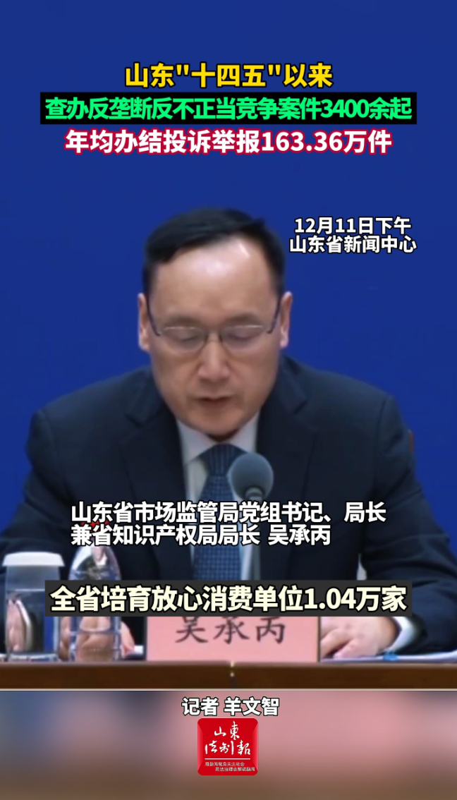 山东省市场监管局党组书记、局长兼省知识产权局局长吴承丙会上介绍,“十四五”以来,山东共查办反垄断反不正当竞争案件3400余起。山东培育放心消费单位1.04万家、无理由退货承诺单位3.2万家,年均办结投诉举报163.36万件、为消费者挽回经济损失1.81亿元。
