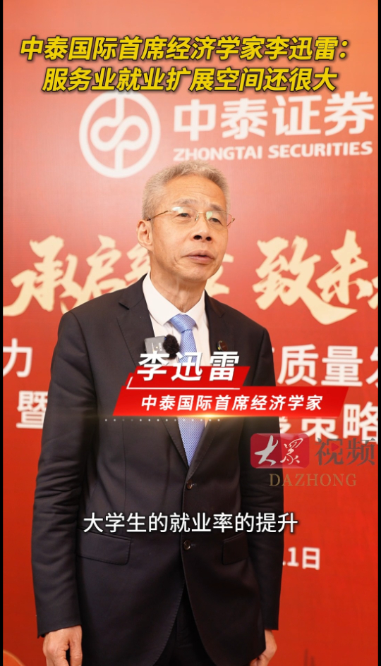 中泰国际首席经济学家李迅雷:服务业就业扩展空间还很大 12-12 原创大众新闻 微信扫码扫码下载客户端12月10日,资本助力“十五五”高质量发展研讨会暨中泰证券年度策略会成功举办。中泰国际首席经济学家李迅雷接受大众日报记者专访。对于大学生就业率提升,李迅雷指出,服务业就业扩展空间还很大,但这既要有政策的支持,也要需要有国民收入再分配的改革,把中等收入群体的比重提高,对于提升服务消费的占比会起到显著作用。(大众新闻记者 都亚男 侯振鹏)