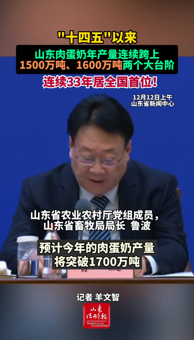“十四五”以来,山东肉蛋奶年产量连续跨上1500万吨、1600万吨两个大台阶,连续33年居全国首位!