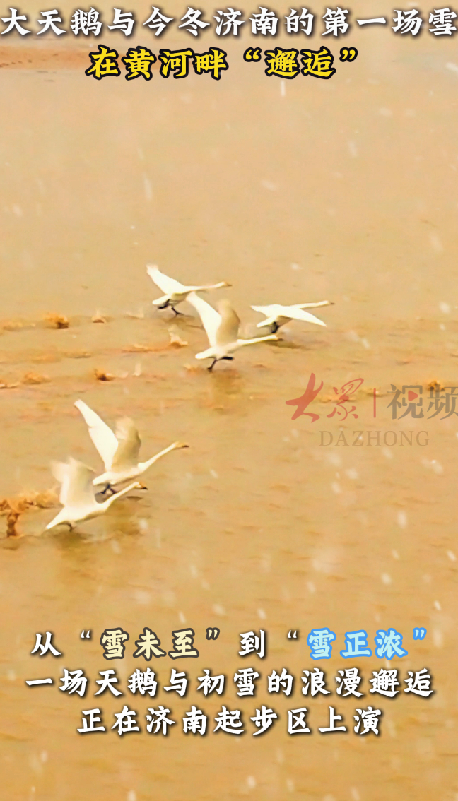 大天鹅与今冬济南的第一场雪在黄河畔“邂逅”大众新闻 | 12-12 原创大众新闻 微信扫码扫码下载客户端12月12日上午,记者在济南新旧动能转换起步区南范村记录下成群的大天鹅。刚刚,济南今冬第一场雪“如期而至”。从‘雪未至’到‘雪正浓’,一场天鹅与初雪的浪漫邂逅正在上演。(大众新闻记者 王雅雯 刘飞跃 胡沥中)