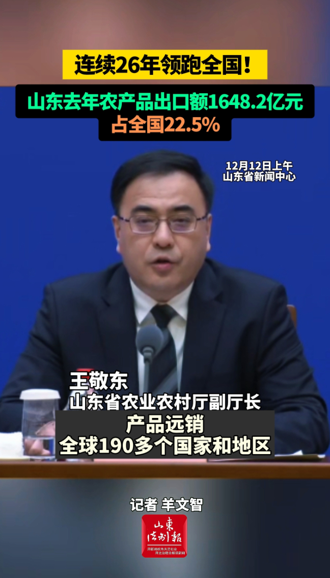 连续26年领跑全国!山东去年农产品出口额1648.2亿元 12-12 现场大众新闻·山东法制报 微信扫码扫码下载客户端12月12日上午,山东省政府新闻办举行新闻发布会,介绍“十四五”时期山东加快推进农业农村现代化情况。山东省农业农村厅副厅长王敬东会上介绍,2024年,山东农产品出口额1648.2亿元,占全国22.5%,农产品出口额连续26年领跑全国,产品远销全球190多个国家和地区。(大众新闻·山东法制报记者 羊文智)