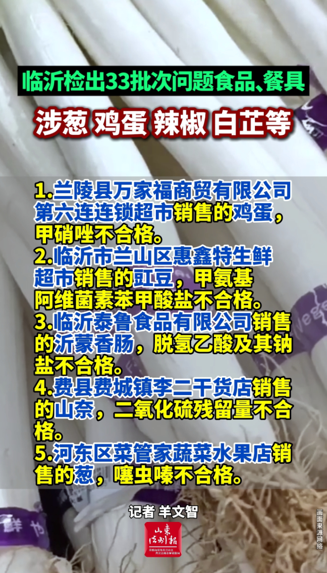 临沂检出33批次问题食品、餐具,涉葱、鸡蛋、辣椒、白芷