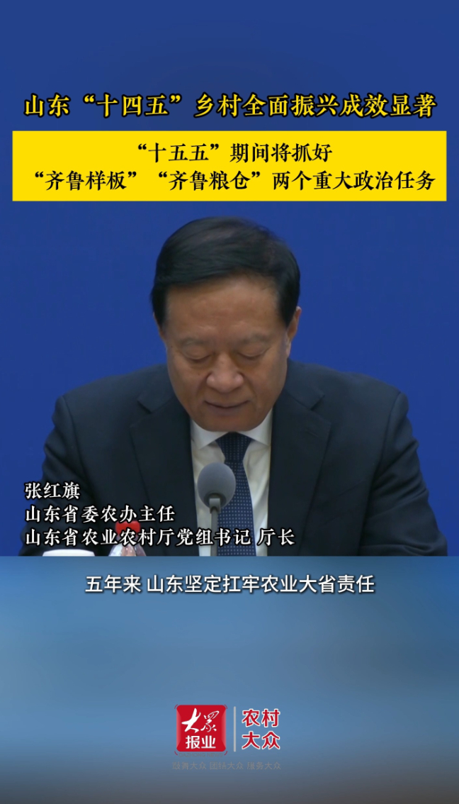 “十五五”期间,山东将抓好 “齐鲁样板”“齐鲁粮仓”两个重大政治任务大众新闻·农村大众 12-12原创12月12日山东省新闻办举行新闻发布会,邀请省农业农村厅主要负责同志等介绍“十四五”时期山东加快推进农业农村现代化情况。发布会上,山东省委农办主任,省农业农村厅党组书记、厅长张红旗表示,五年来,山东坚定扛牢农业大省责任,统筹推进乡村产业发展、乡村建设和乡村治理,农业农村现代化迈出坚实步伐,乡村全面振兴取得显著成效。(大众新闻·农村大众记者 刘雯)