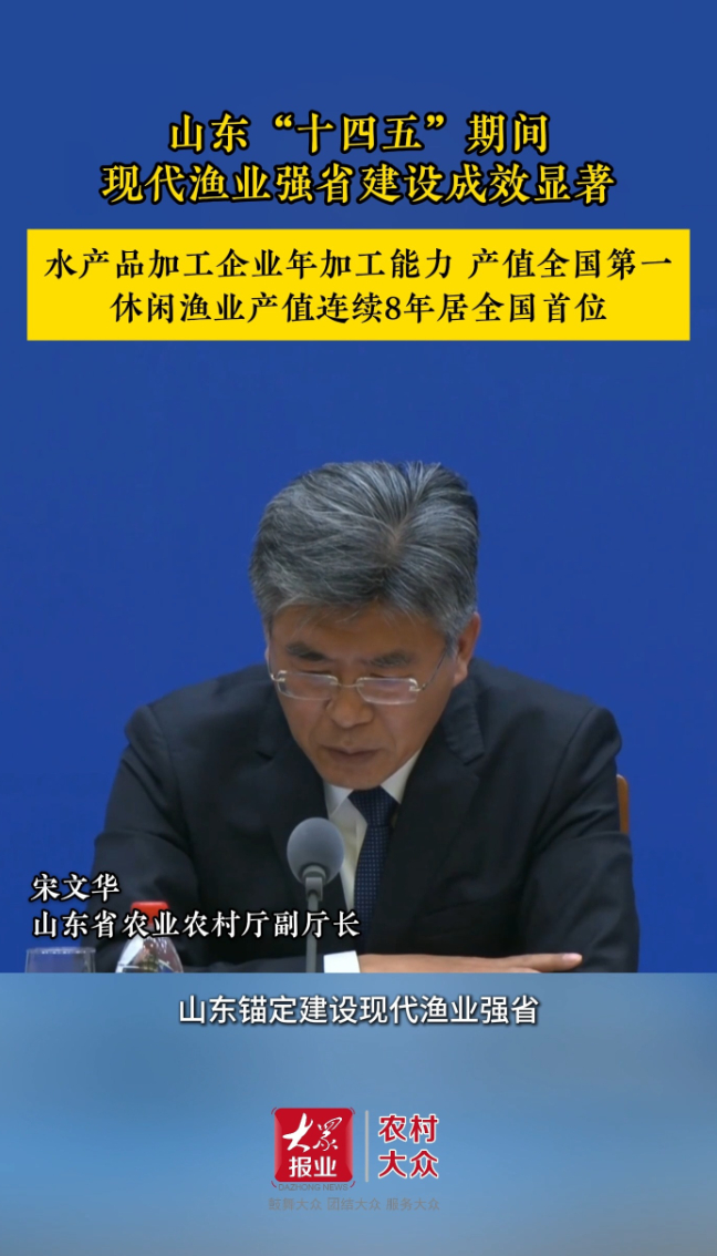 山东水产品加工企业年加工能力、产值全国第一大众新闻·农村大众 12-12原创12月12日山东省新闻办举行新闻发布会,邀请省农业农村厅主要负责同志等介绍“十四五”时期山东加快推进农业农村现代化情况。山东省农业农村厅副厅长宋文华介绍,“十四五”以来,山东锚定建设现代渔业强省,坚持科技引领、陆海联动,推动渔业高质量发展取得重要阶段性成效。2024年,全省水产品产量952.7万吨,渔业经济总产值4904亿元,多项工作走在全国前列。(大众新闻·农村大众记者 刘雯)