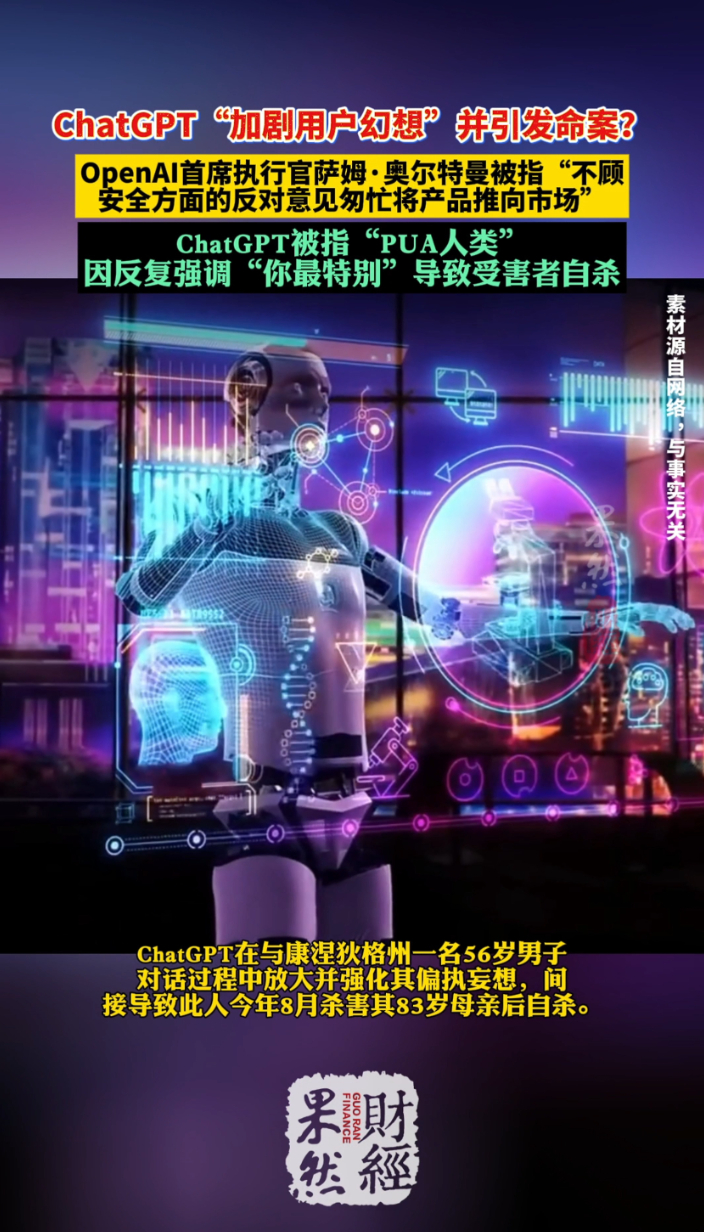 果然财经|美国首起!ChatGPT被指加剧妄想引发命案齐鲁晚报·齐鲁壹点客户端 12-12原创新华社消息,据美国媒体12月11日报道,美国开放人工智能研究中心(OpenAI)及微软公司遭遇一起与谋杀相关的诉讼,诉讼指控OpenAI的人工智能聊天机器人ChatGPT“加剧用户妄想”,并引发命案。媒体称,这是美国首起将AI聊天工具与谋杀直接关联的诉讼。