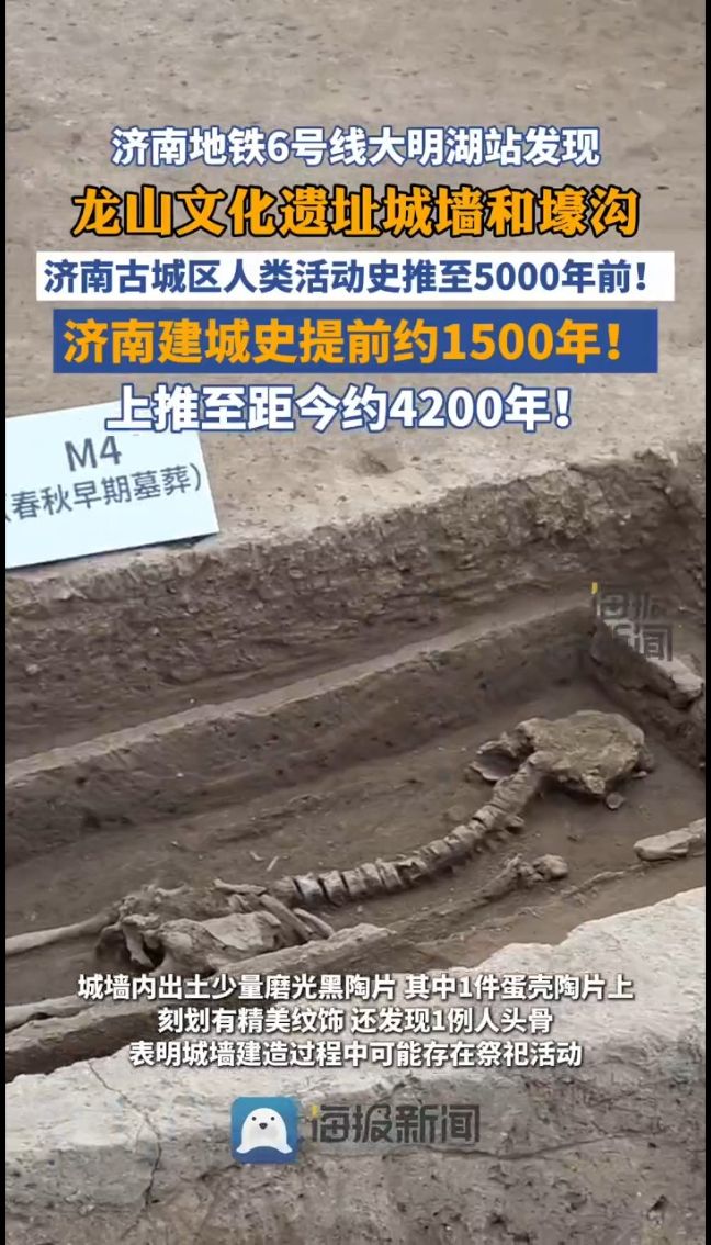 济南地铁6号线大明湖站发现龙山文化遗址城墙和壕沟,将济南古城区人类活动史推至5000年前