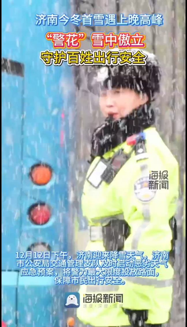 济南晚高峰迎降雪 “警花”雪中傲立保障市民出行安全大众新闻·海报新闻 12-12原创12月12日下午,济南迎来降雪天气,济南市公安局交通管理支队及时启动恶劣天气应急预案,将警力最大限度投放路面,加强巡逻管控和重点路段值守,排查道路结冰等交通安全隐患,全力做好雨雪天气应急处置工作,保障市民出行安全。(大众新闻·海报新闻记者 辛振东 济南报道)